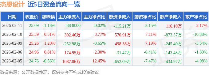 证券之星消息,截至2026年2月11日收盘,杰恩设计(300668)报收于25.09元,下跌1.18%,换手率2.14%,成交量2.13万手,成交额5356.06万元。